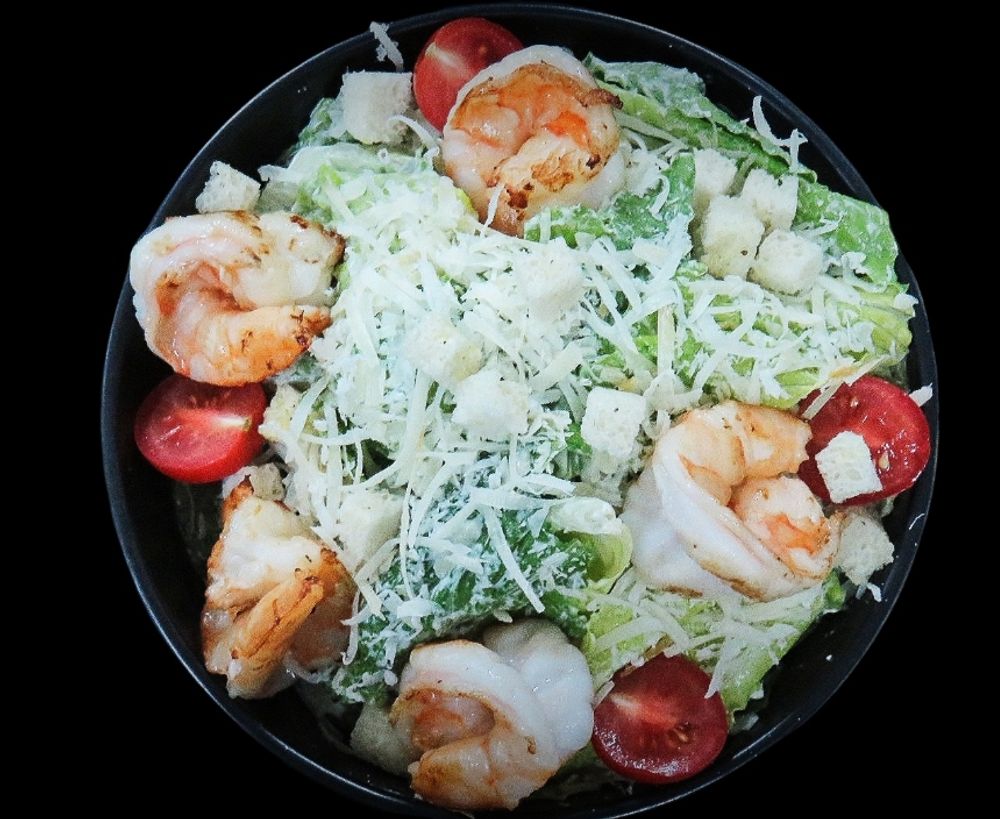 Состав:креветки, салат айсберг, соус цезарь, помидор черри, гренки пшеничные, сыр пармезан.