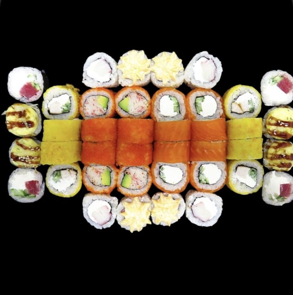 На фото представлены запечённые роллы без соуса сверху для информирования клиента о начинке. Сет Всё включено — это ассорти из четырёх популярных видов роллов: Лава с крабом, Куриный темпура, Запечённый тунец и Филадельфия, а также классический ролл Калифорния (40 шт.)