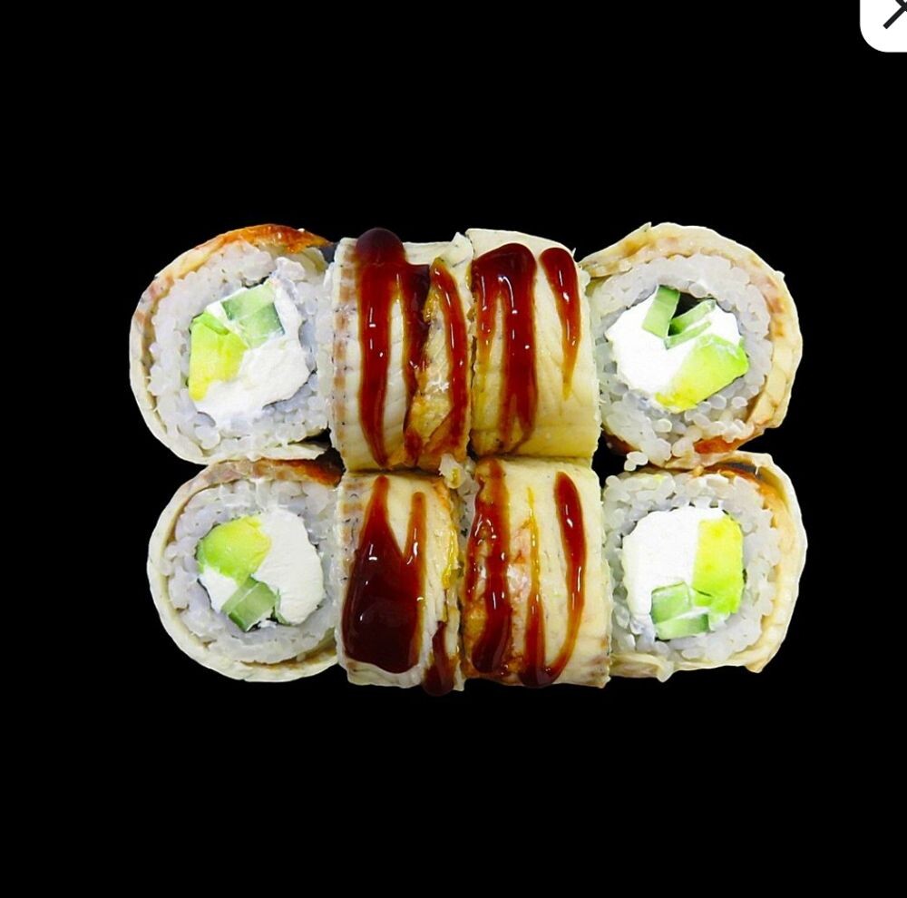 Состав:угорь,огурец,авокадо,сыр сливочный,нори,рис,соус унаги,кунжут.