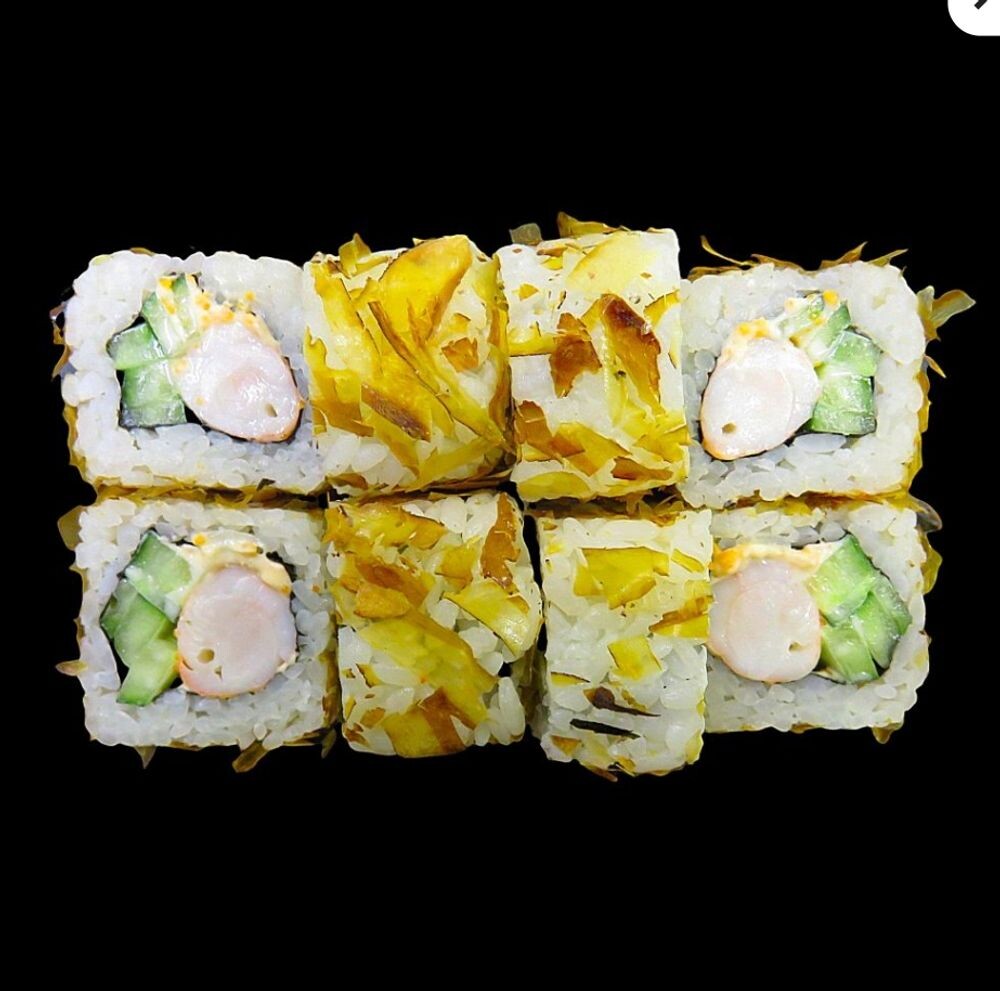 Состав:креветки,стружка тунца,соус азбука,рис,огурцы свежие,водоросли нори.