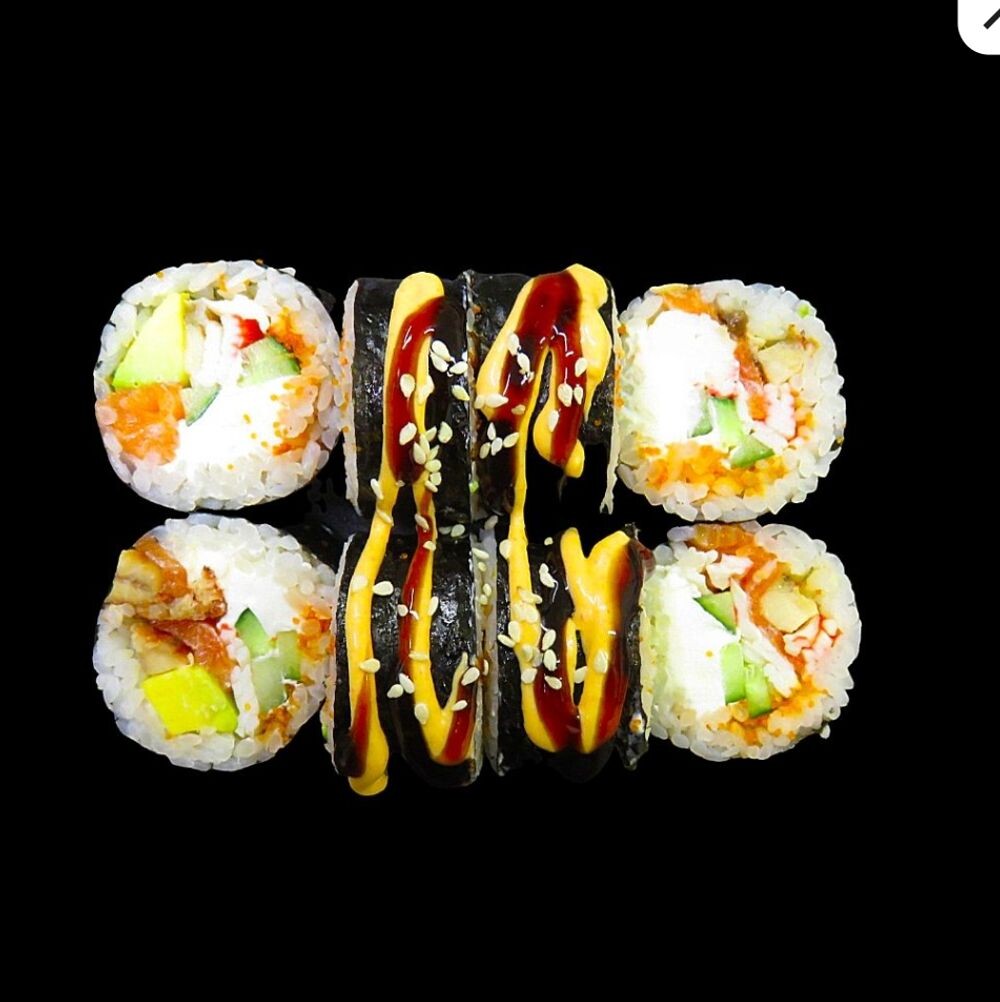 Состав:,авокадо,сыр сливочный,нори,рис,икра тобико,снежный краб,лосось,угорь,огурец,соус спайси,соус унаги,кунжут.