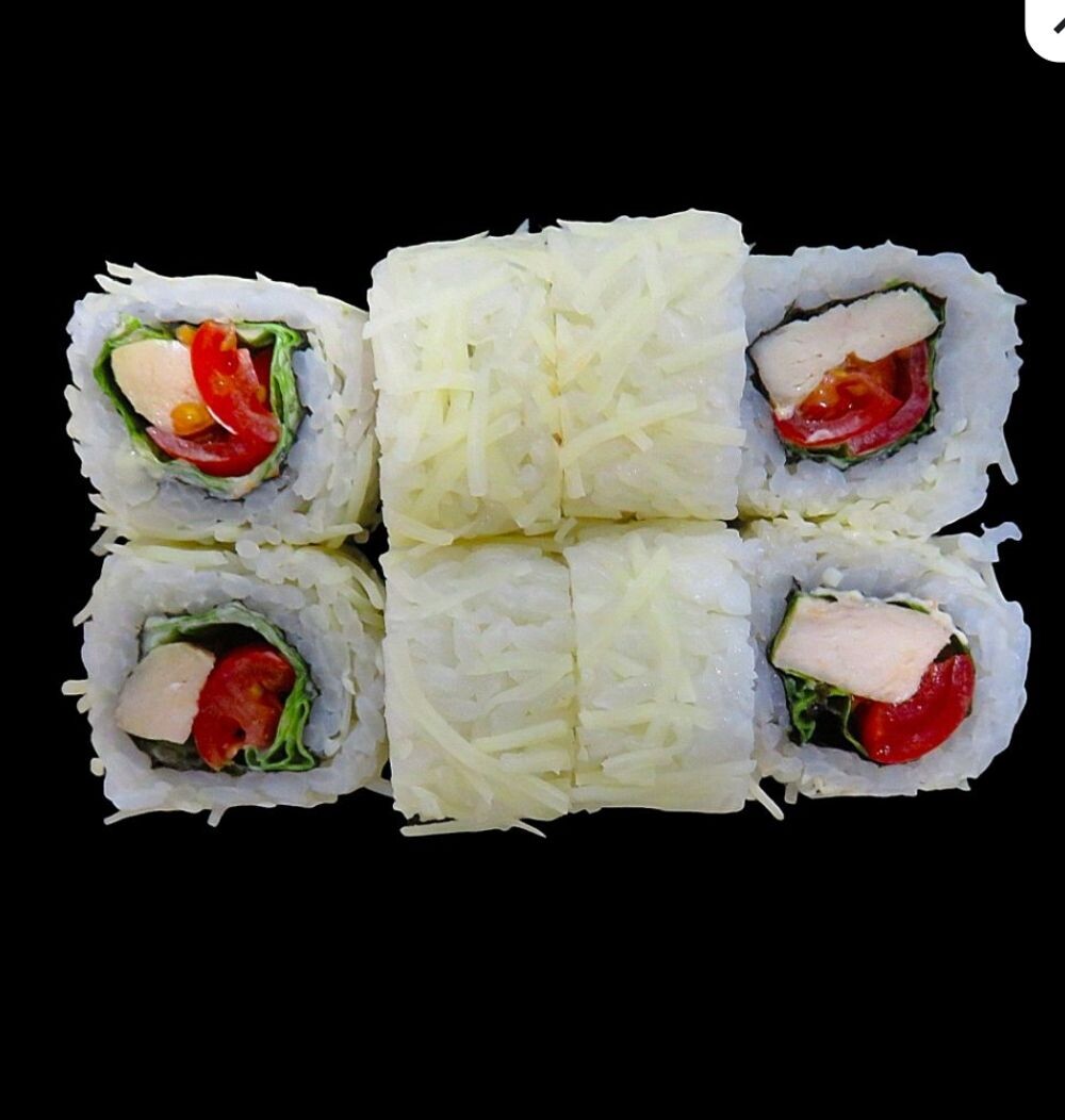 Состав:куриное филе,соус цезарь,помидор черри.салат айсберг,сыр пармезан,нори,рис.