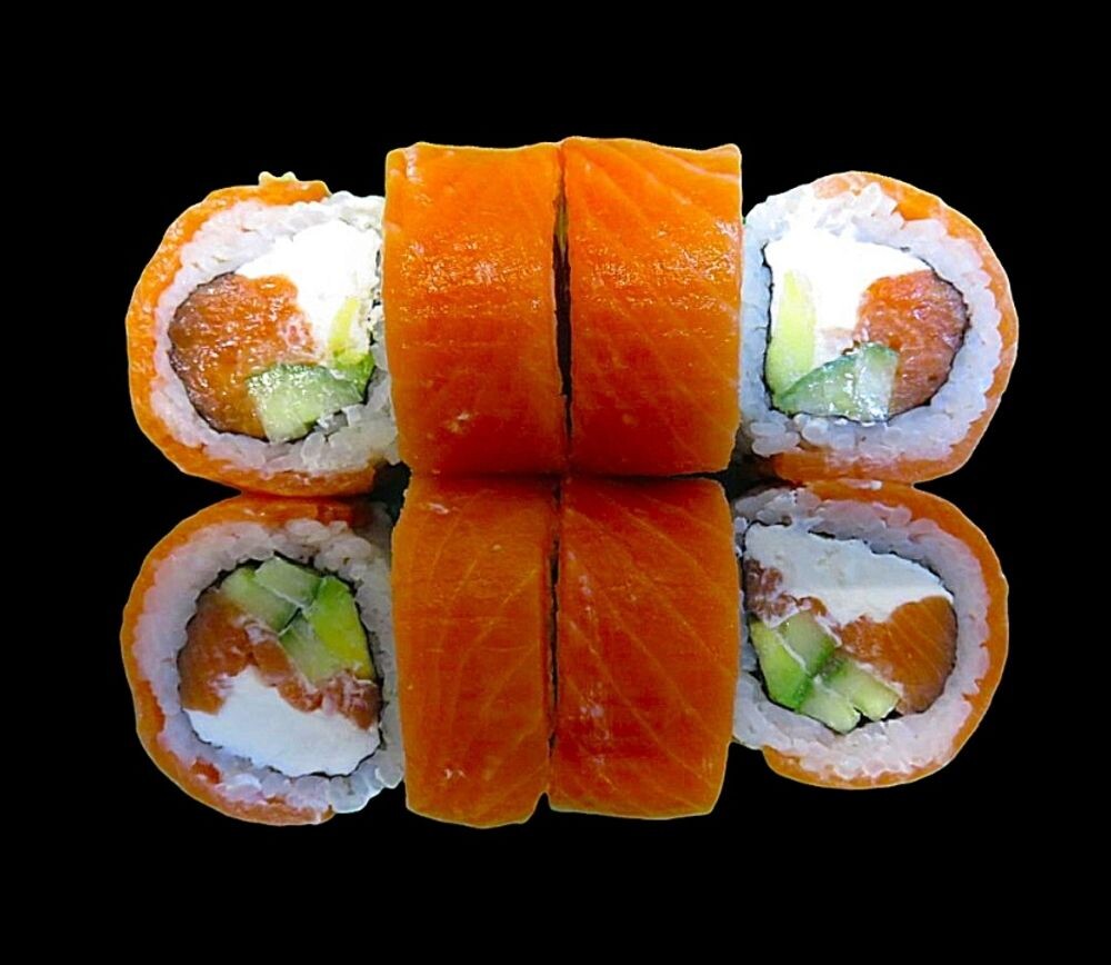 Состав: лосось,сыр сливочный,рис, авокадо, огурец,нори.