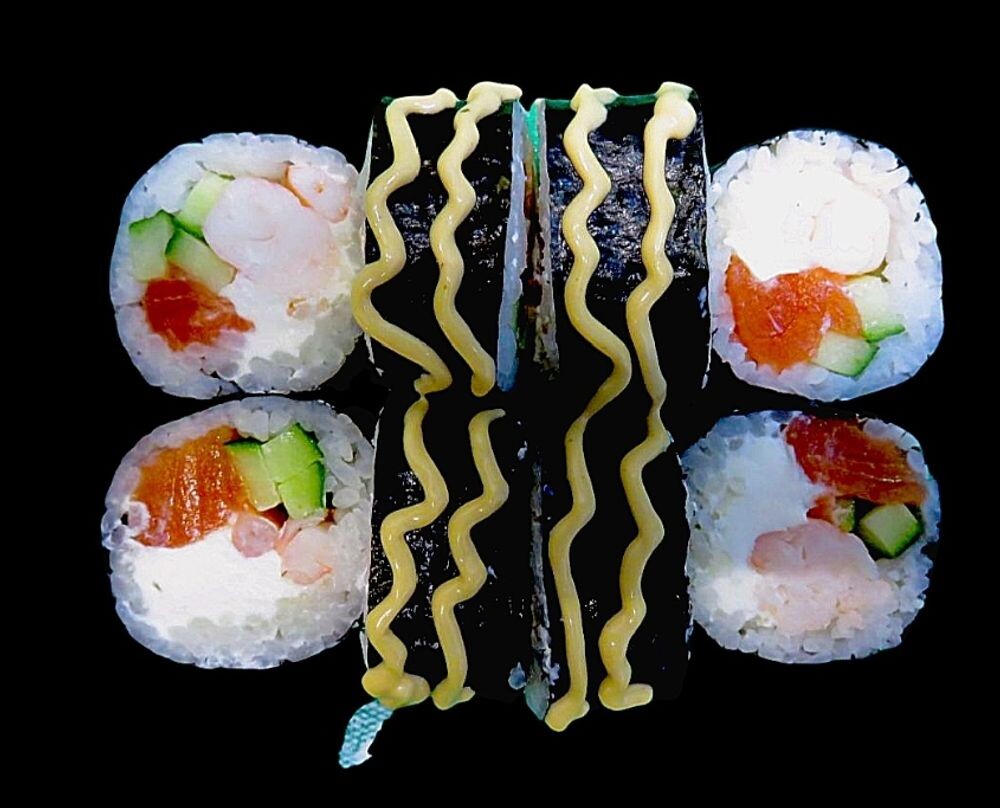 Состав: креветки,лосось, сыр сливочный, рис, огурец,нори,соус сегун.
