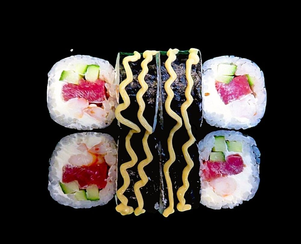 Состав: тунец, креветки,сыр сливочный, рис, огурец, нори,соус сегун.