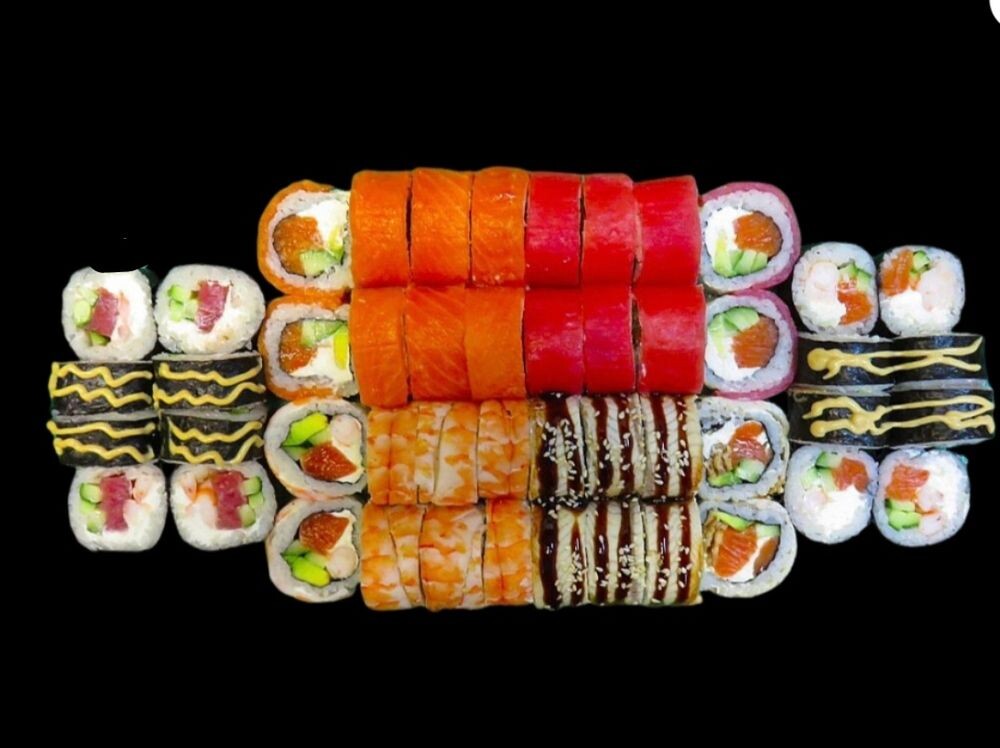 Состав:ролл с лососем премиум, ролл Креветки премиум, ролл Тунец премиум, ролл с угрём премиум, ролл Креветки-лосось премиум, ролл Креветки-тунец премиум.