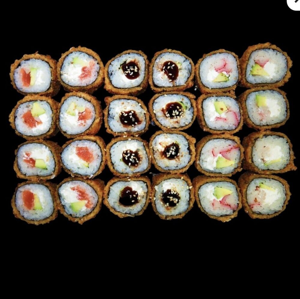 Состав:ролл жаренный с угрем,ролл жаренный Калифорния,ролл жаренный Филадельфия.