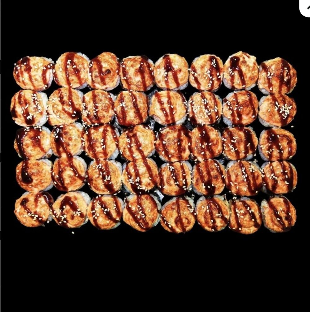 Состав:запеченный ролл с куриным филе,запеченный ролл с лососем,запеченный ролл с угрем,запеченный ролл с креветками,запеченный ролл с тунцом.