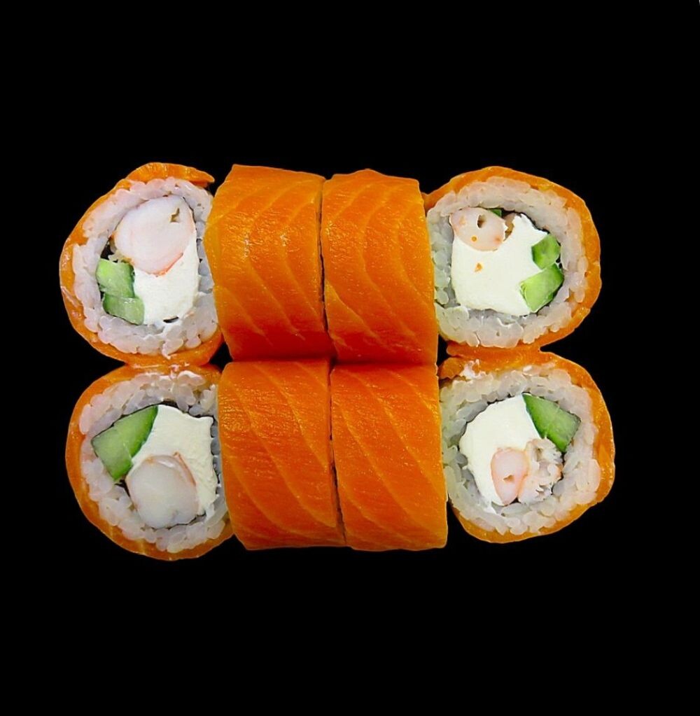 Состав:лосось,креветки,огурец,сыр сливочный,нори,рис.