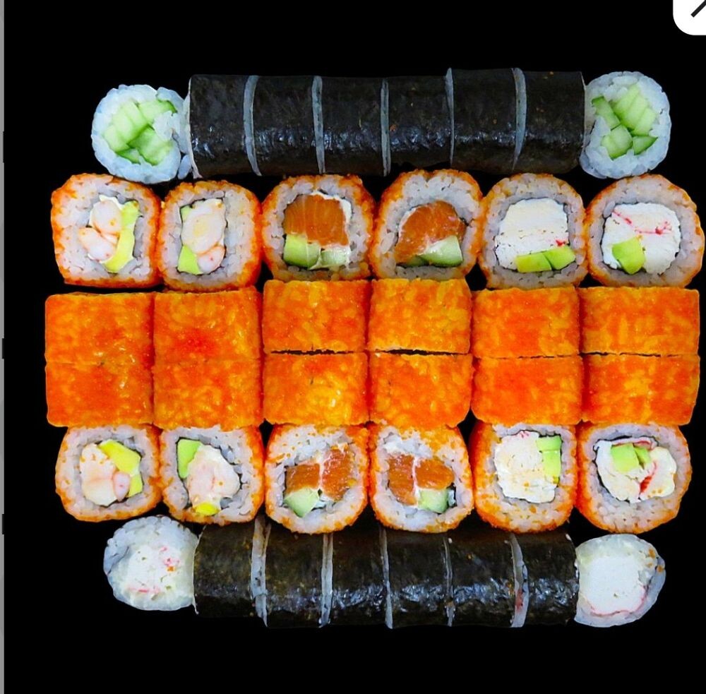 Состав: ролл Калифорния классик, ролл Калифорния с лососем, ролл Калифорния с креветками, ролл капа маки, ролл Кани маки