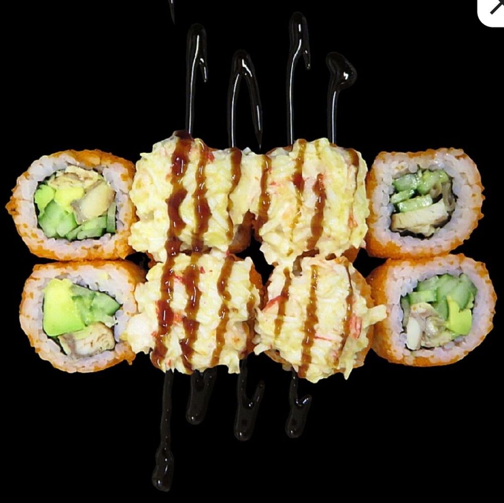 Состав:угорь, креветки, снежный краб,рис,нори,майонез,икра тобико, авокадо, огурец,соус унаги.