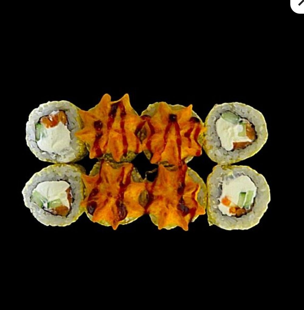 Состав:лосось,рис, нори, огурец,сыр сливочный,соус Азбука, соус унаги, кунжут.