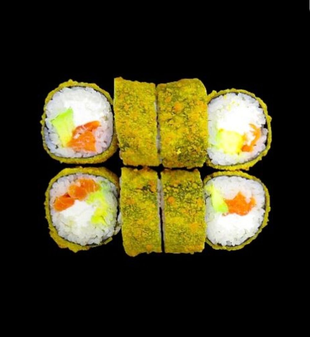 Состав:лосось,сыр сливочный,панировка,рис,огурцы свежие,водоросли нори.
