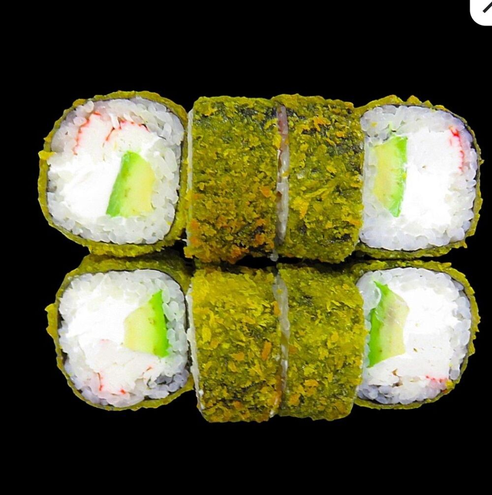 Состав:снежный краб,сыр сливочный,панировка,рис,огурцы свежие,водоросли нори.