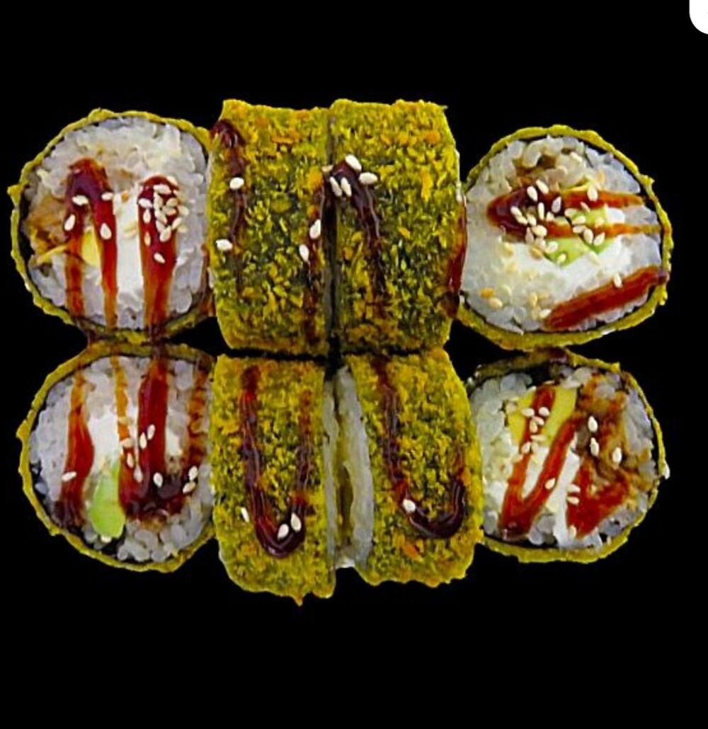 Состав:угорь,рис,нори,кляр,сыр сливочный, огурец,соус унаги, кунжут.