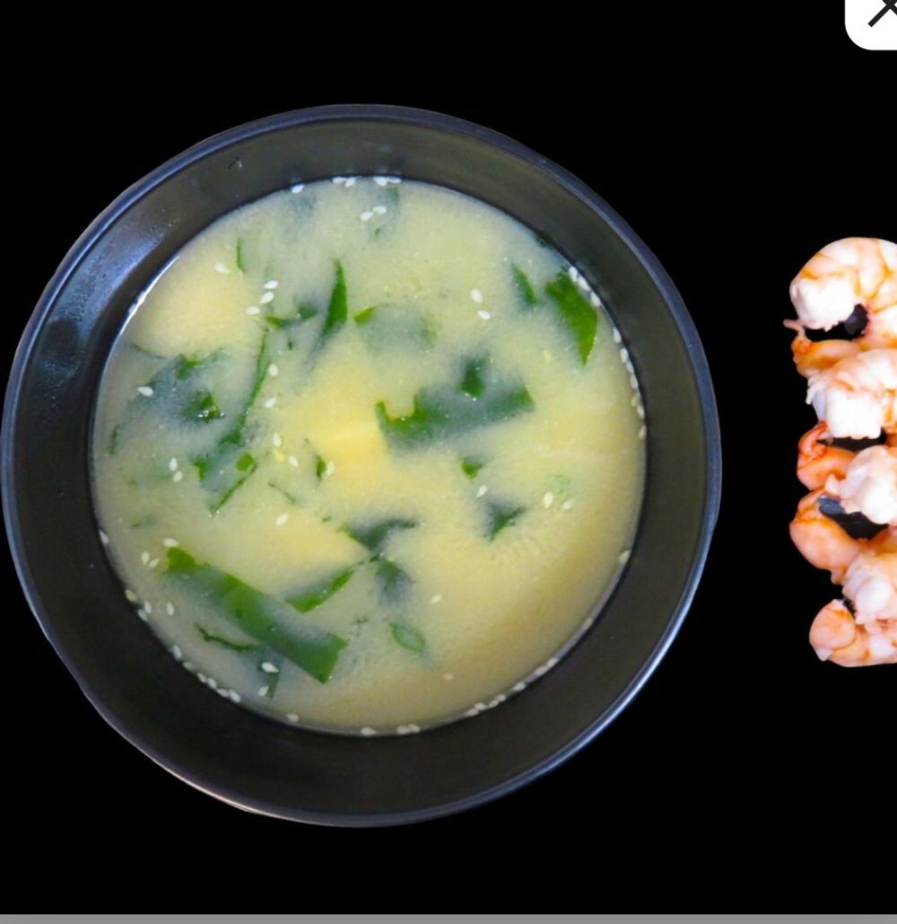 Традиционный японский суп на основе рыбного бульона и пасты мисо. В составе — водоросли, зелёный лук и кубики сыра тофу. Завершающий штрих — крупные креветки и щепотка кунжута. Вкус блюда удивляет гармоничным сочетанием оттенков: от солёного до пикантного.