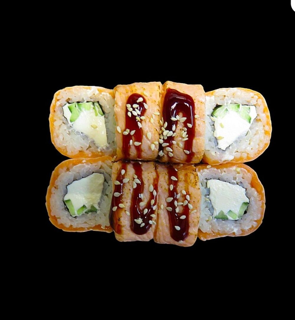 Состав:лосось,огурец,сыр сливочный,нори,рис, соус унаги, кунжут.